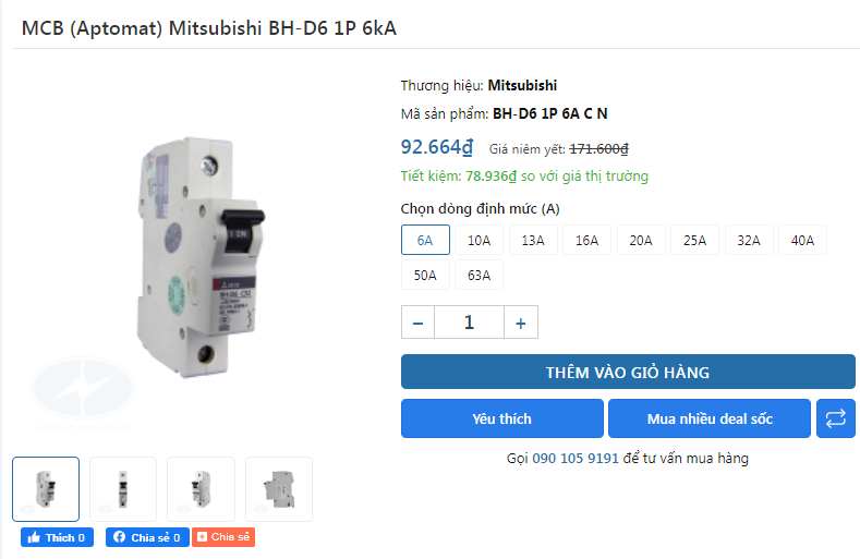 Định mức: 6A - 10A - 13A - 16A - 20A - 25A - 32A - 40A - 50A - 63A