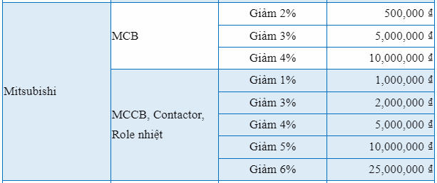 - Ưu đãi từ 2 – 4% khi mua sản phẩm MCB Mitsubishi cho đơn hàng từ 500K