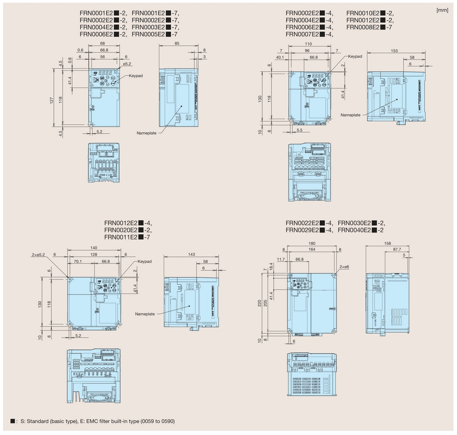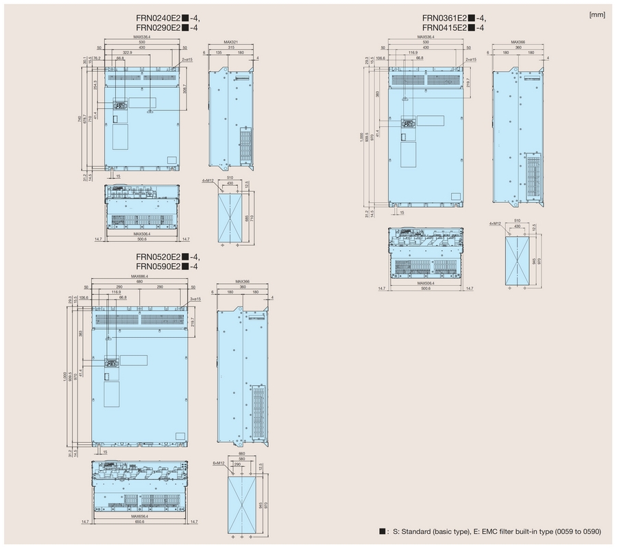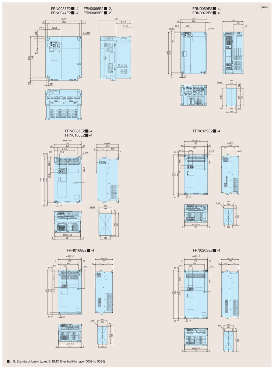 (FRN0002-FRN0007)E2S-4G:130x110x119mm FRN012E2S-4G: 130x140x143mm (FRN0022-FRN0029)E2S-4G: 220x180x158mm (FRN0037-FRN0044)E2S-4G: 260x220x190 mm (FRN0059-FRN0072)E2S-4G: 400x250x195 mm (FRN0085-FRN0105)E2S-4G: 550x326.2x261 mm FRN0139E2S-4G: 615x361.2x276 mm FRN0168E2S-4G:675x361.2x276 mm FRN0203E2S-4G: 740x361.2x276 mm (FRN0240-FRN0290)E2S-4G: 740x536.4x321 mm |