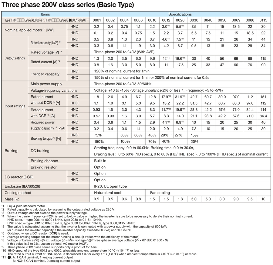 +HHD (High carrier frequency heavy duty): Tải nặng, khả năng quá tải 150%/1 phút-200%/0.5 giây, nhiệt độ môi trường max 50°C.