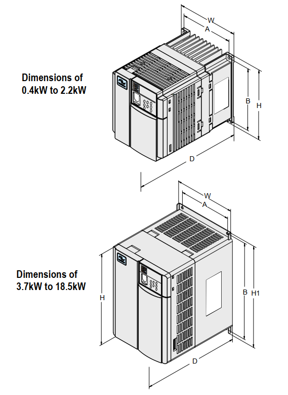 0.4kW-2.2kW: 158x108x128 (mm) 3.7kW-5.5kW: 164x130x209 (mm) 7.5kW-11kW: 171x140x260 (mm) 15kW-18.5kW:176x180x298 (mm) |