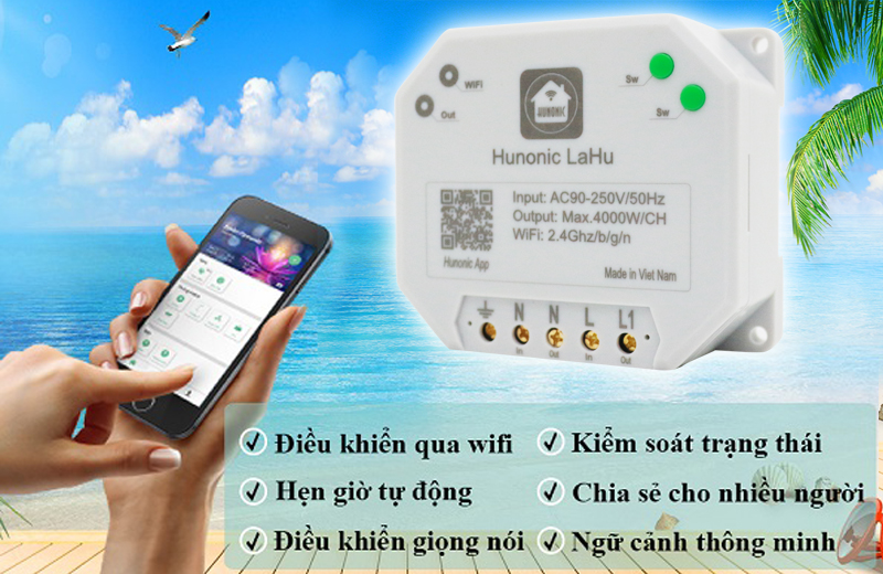 Công tắc thông minh Hunonic Lahu 1 kênh chuyên dùng lắp nổi, bắn vít hoặc lắp trong hộp điện kỹ thuật.