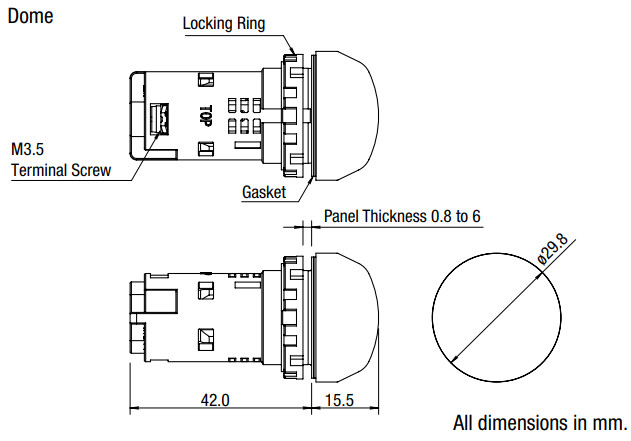Đèn báo vòm unibody Idec Ø 22 được thiết kế nhỏ gọn giúp tiết kiệm không gian bên trong tủ điện. Vật liệu trên bề mặt thiết bị được thiết kế để giảm khả năng phản xạ ánh sáng bên ngoài. Đèn báo được sản xuất có độ sáng cao và góc nhìn rất rộng.
