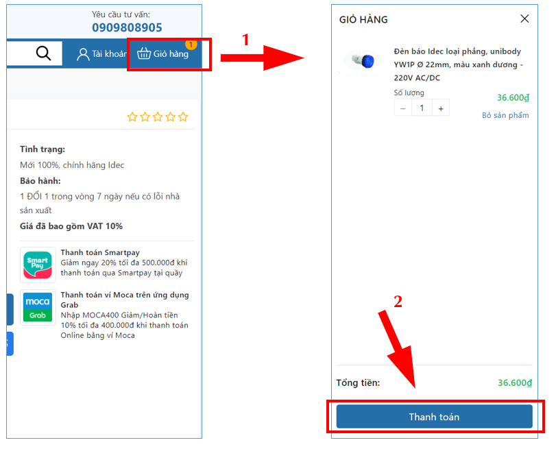 Khi đã hoàn tất việc chọn sản phẩm cần mua vào giỏ hàng, bạn tiến hành thanh toán như sau: