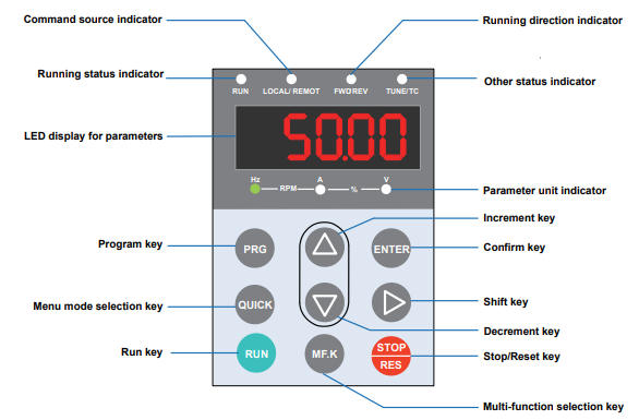 Bên cạnh đó, keypad còn hiển thị các thông số của biến tần (Volts, Ampe,Hz,...) để giúp dễ dàng theo dõi tình trạng của biến tần
