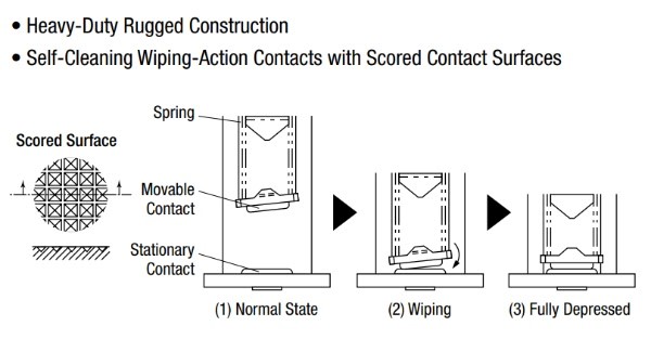 Trong đó, các tiếp điểm sẽ chuyển trạng thái khi có tác động lên nút nhấn và ngược lại. Khi không còn tác động lên nút nhấn nữa thì tiếp điểm quay về trạng thái ban đầu.